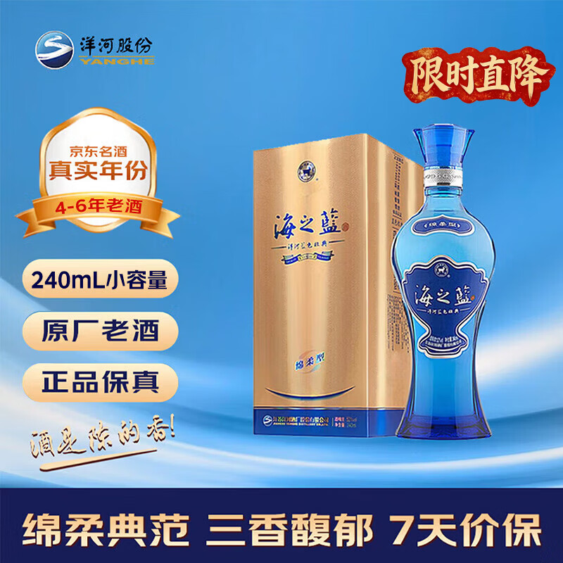 自营洋河 蓝色经典 海之蓝13版 2020-2022年随机 浓香型白酒 52度 240ml 单瓶装 陈年老酒