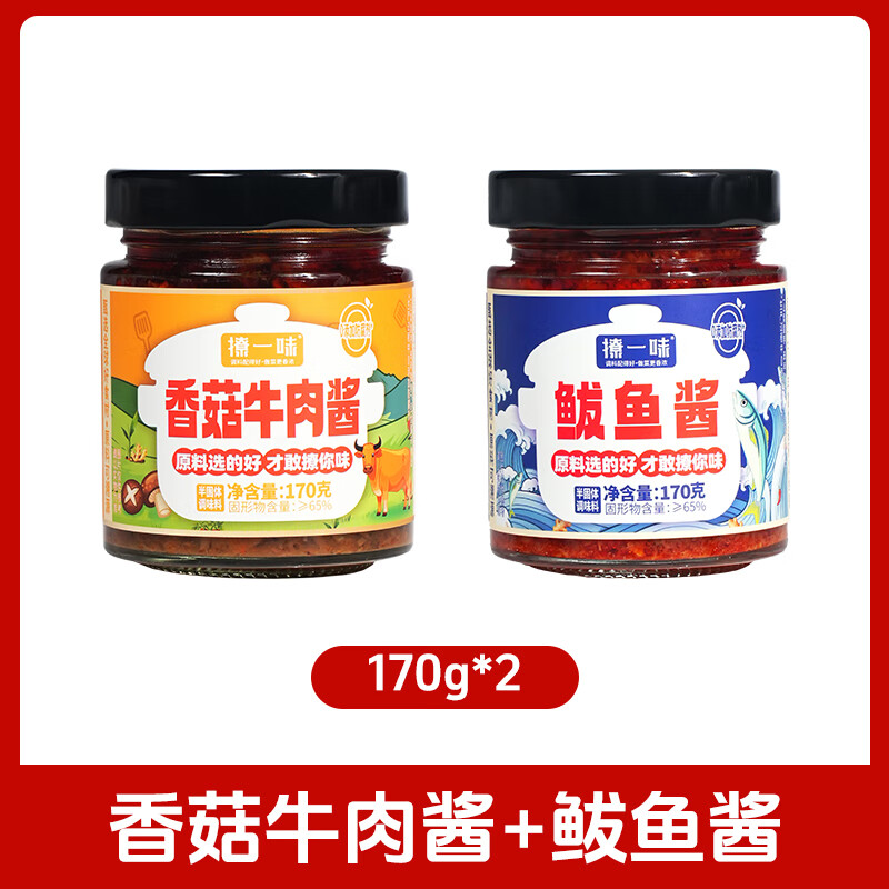 旗舰店撩一味香菇牛肉酱香辣虾酱特产鲅鱼酱烧椒辣椒辣子酱下饭菜拌饭酱海鲜酱 香菇牛肉酱+鲅鱼酱【2瓶装】