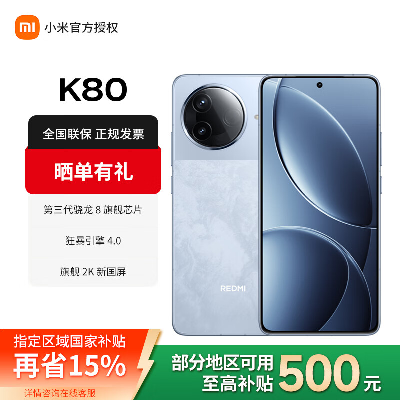 旗舰店小米(MI)REDMI 红米K80 新品5G手机 第三代骁龙8 6550mAh大电池长续航 2K屏 ultra 汐月蓝 12GB+256GB