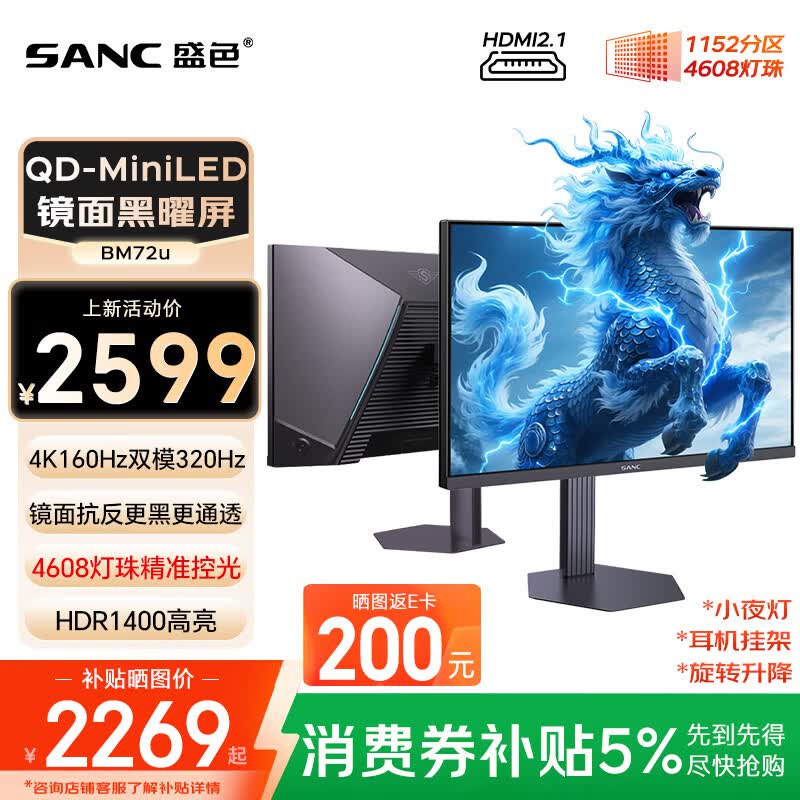 自营SANC盛色27英寸4K160Hz双模320Hz黑耀屏 4608灯珠量子点MiniLED电竞显示器镜面抗反光HDR1400亮度BM72u