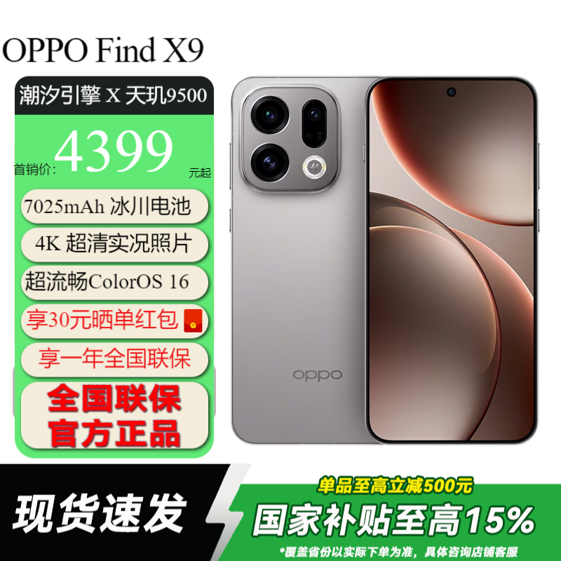 旗舰店OPPO Find X9 旗舰手机 4K超清实况照片 7025mAh大电池 天玑9500 旗舰手机 全网通5G 绒光钛 12GB+256GB