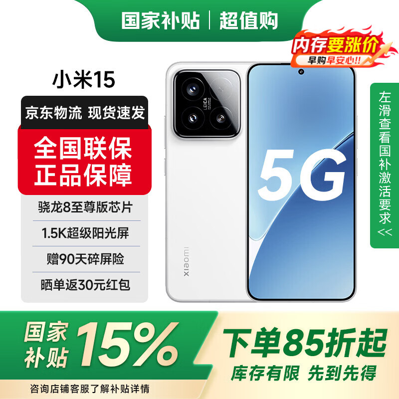 旗舰店小米15 小米5G手机 小米15 徕卡光学Summilux高速镜头 骁龙8至尊版移动平台 16GB+512GB 白色 官方标配 全网通