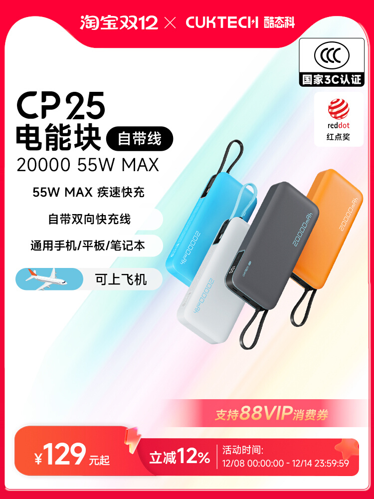 百亿补贴【3C认证可上飞机】CUKTECH酷态科2025新款充电宝CP25自带线20000毫安时移动电源PD快充适用于iPhone苹果17