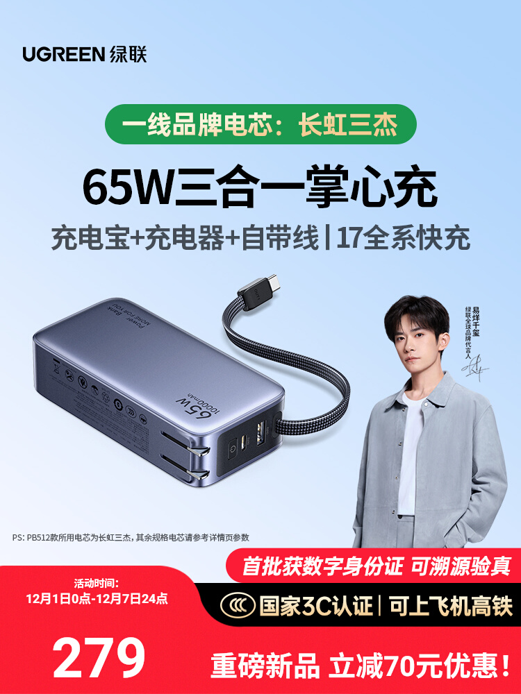 旗舰店【充电宝3C认证可上飞机】绿联2025新款三合一充电宝自带线插头10000毫安65w快充便携移动电源适用苹果17华为