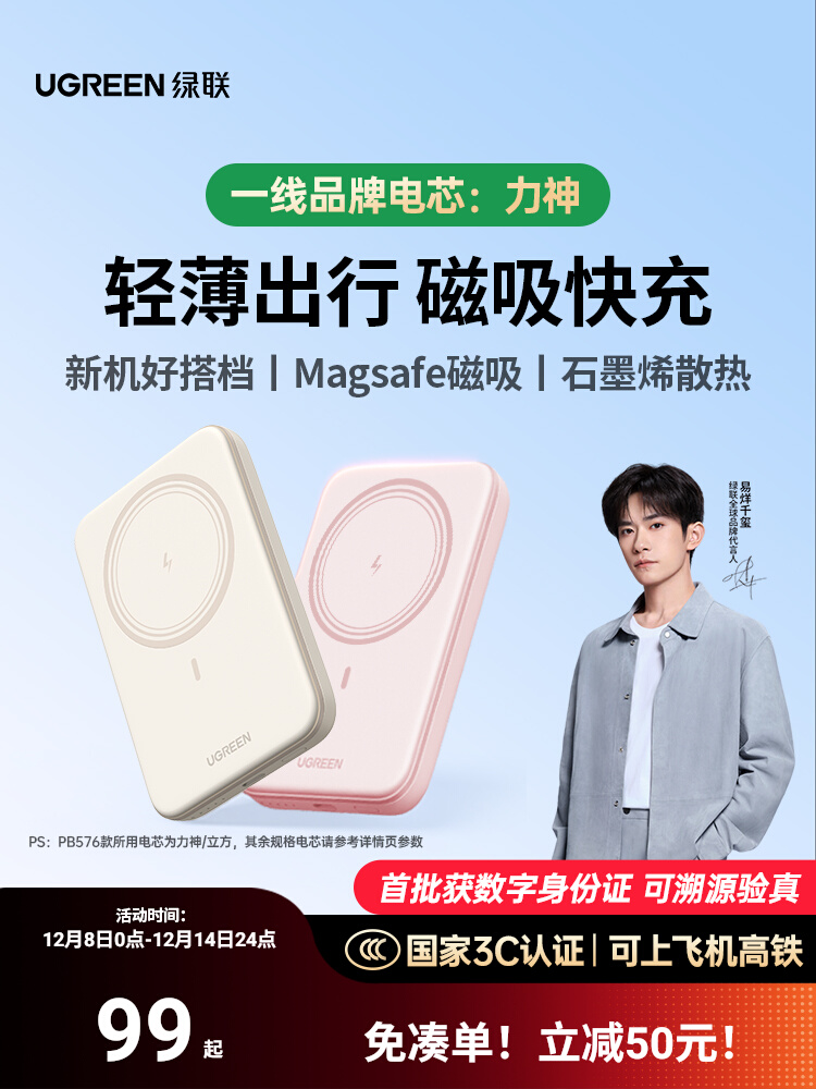旗舰店【充电宝3C认证可上飞机】绿联2025新款磁吸无线充电宝17适用苹果专用快充16超薄便携大容量移动电源正品官方