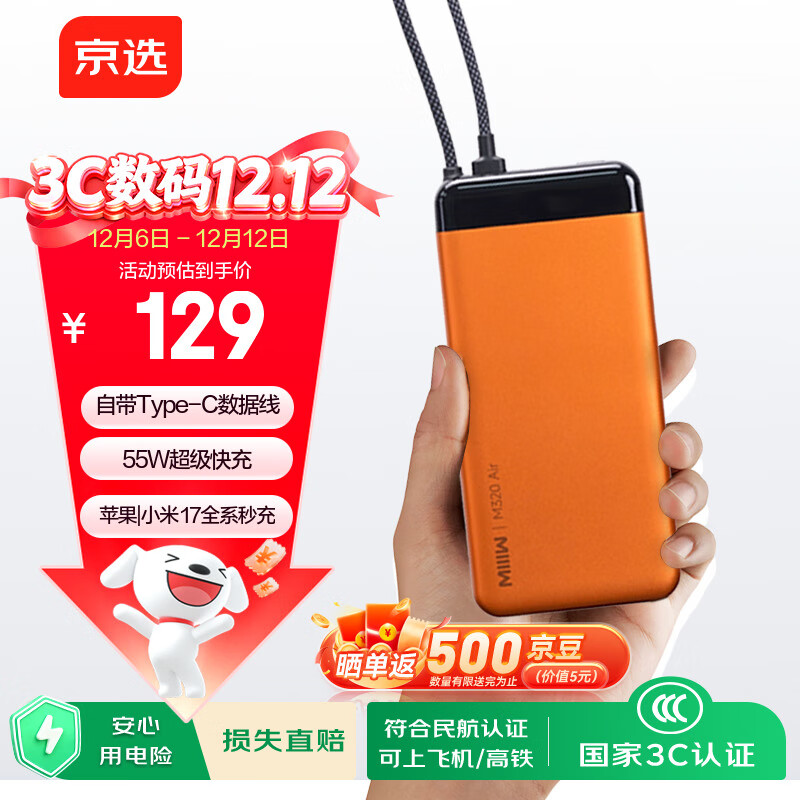 自营京选米物联名款【3C认证可上飞机】20000mAh55W快充自带线充电宝小米快充兼容苹果华为22.5W橙色
