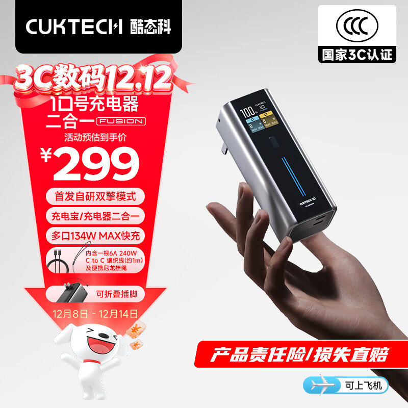 自营CUKTECH酷态科【3C认证可上飞机】10号电能充二合一Fusion充电宝多口134W自带插头小巧大容量快充移动电源