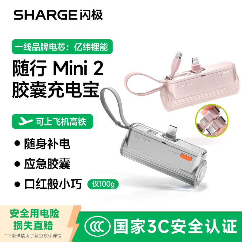 自营SHARGE闪极【新3C认证】随行mini2胶囊充电宝22.5W快充自带线便携小巧移动电源适用苹果17华为荣耀手机