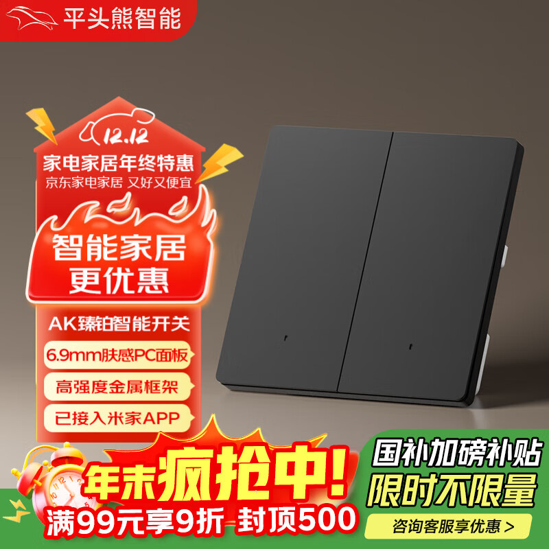 自营平头熊PTX智能开关AK臻铂 零火双开灰色 接入米家APP 蓝牙mesh2.0
