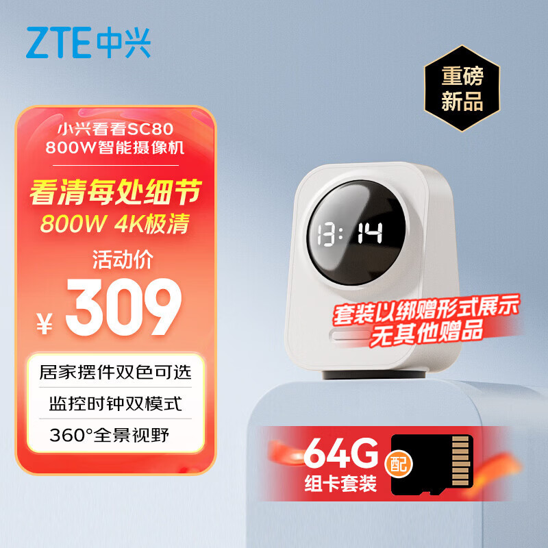 自营中兴(ZTE)小兴看看SC80云台版800万像素 超微光全彩 AI人形侦测手机查看双频家用摄像头监控 白色64G卡套装
