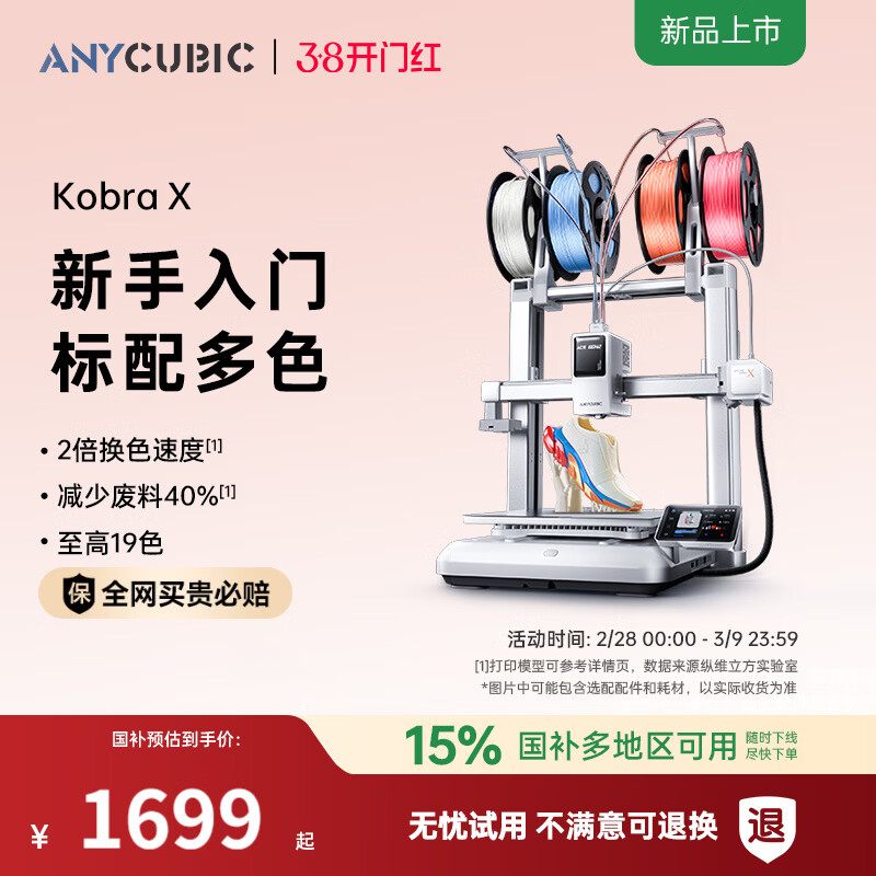 自营ANYCUBIC【重磅新品】纵维立方KX多色3D打印机Kobra X天生四色FDM高速桌面级三d立体打印机家用儿童模型diy