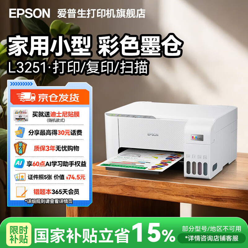 旗舰店爱普生(EPSON)L3251 L3253打印机家用小型彩色照片喷墨仓式连供A4手机L3355 3353无线复印一体机作业试卷学生用 【经典款】L3251 白色(无线打印扫描三合一) 官方标配