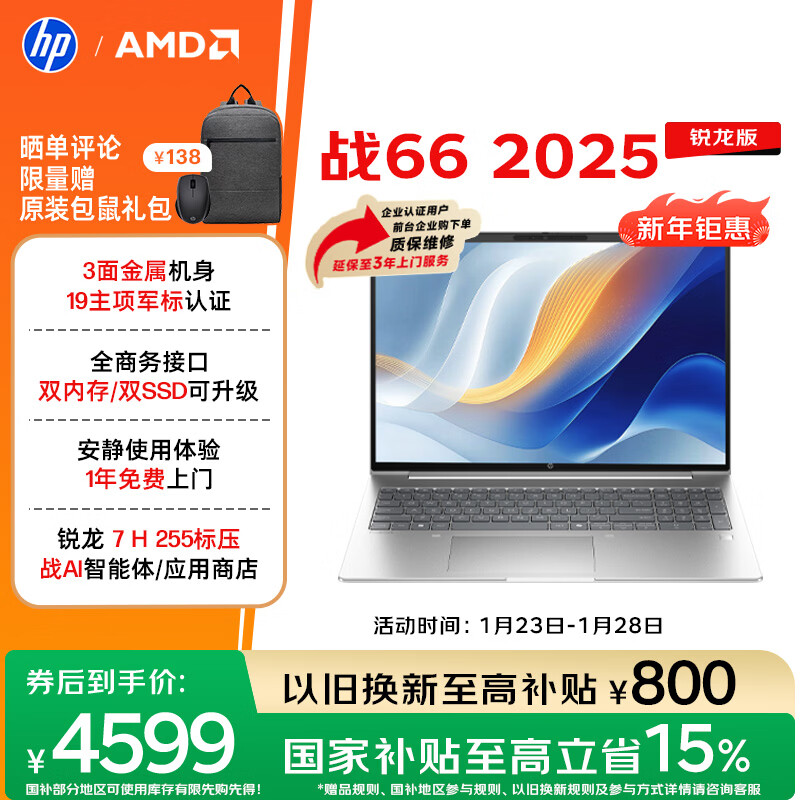自营惠普(HP)战66 16英寸2025轻薄笔记本电脑 标压锐龙7 H 255 16G 1T 高清屏 1年上门【国家补贴】