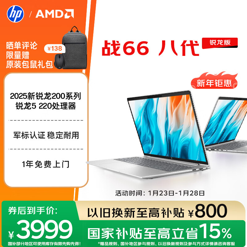 自营惠普(HP)战66八代 16英寸轻薄笔记本电脑 25新200系列(锐龙5 16G 512G 军标认证 一年上门 战AI)国家补贴