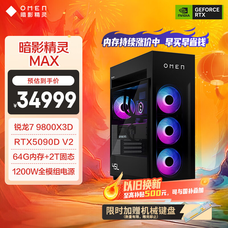 自营惠普(HP)暗影精灵Max 旗舰游戏电竞台式电脑主机(R7 9800X3D RTX5090DV2 64G DDR5 2TB 水冷 1200W电源)