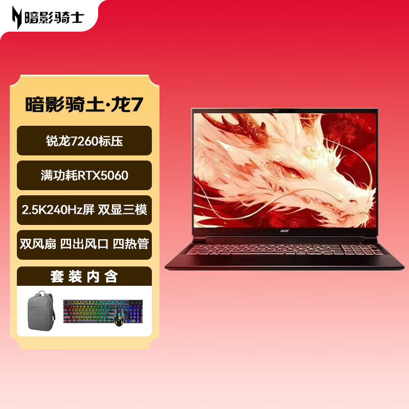 宏碁(acer)暗影骑士·龙 16英寸游戏本 标压 锐龙7 H 260 16G 1TB RTX5060 2.5K 240Hz 包鼠套装