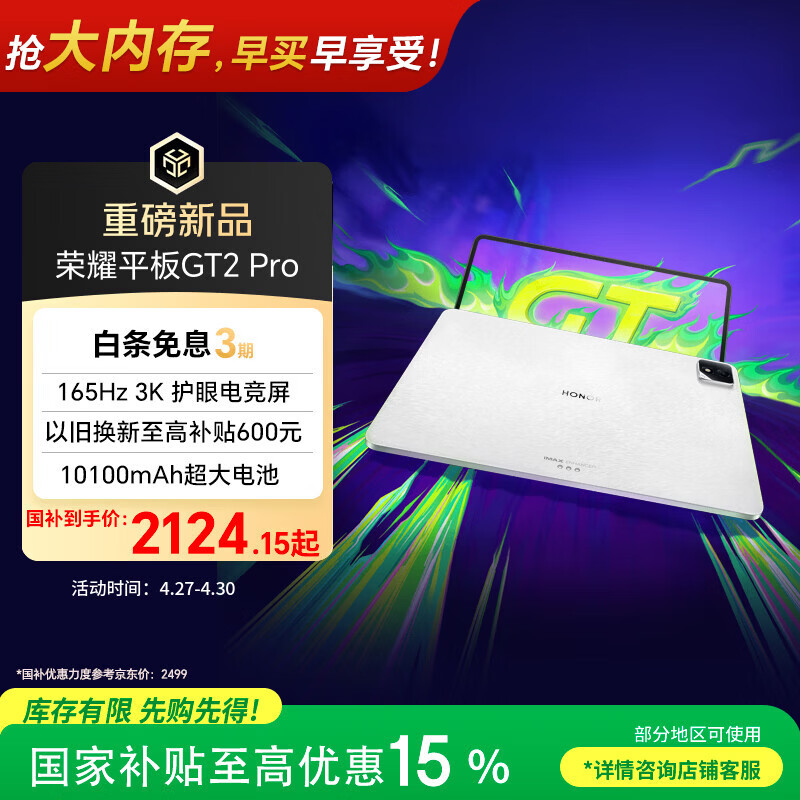 自营荣耀平板GT2 Pro 12.5英寸平板电脑 165Hz 3K护眼电竞屏 满血8Gen3旗舰芯 8+128GB 冰晶白【国家补贴】