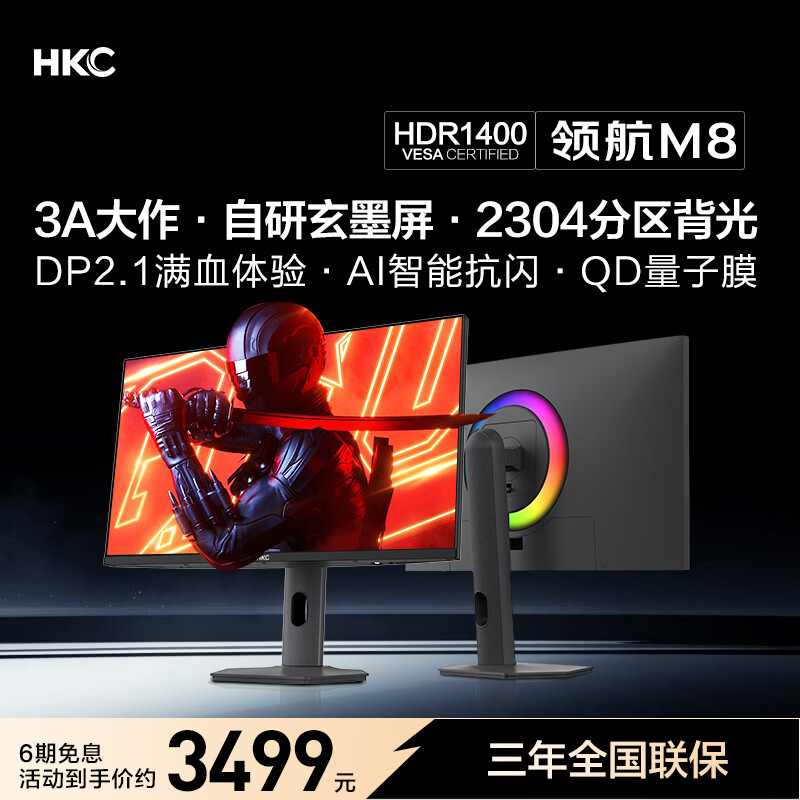 自营HKC 27英寸4K 160Hz双模320Hz MiniLED 2304分区玄墨屏游戏电竞Type-C90W旋转升降DP2.1显示器领航M8