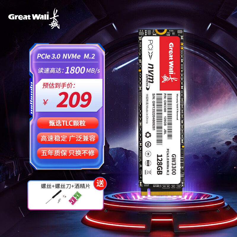 自营长城(Great Wall)128GB SSD固态硬盘 M.2接口(NVMe协议)PCIe 3.0 GW3300系列