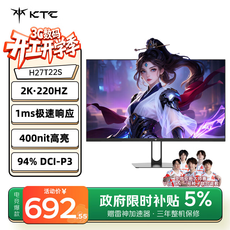 自营KTC 27英寸2K 220Hz高刷 10bit色深 FastIPS 快速液晶显示屏外接笔记本电脑显示器H27T22S新一代