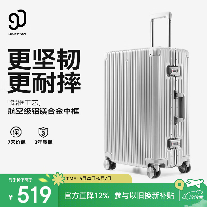 自营90分行李箱24英寸铝框拉杆箱大容量旅行箱万向轮密码箱皮箱太空银