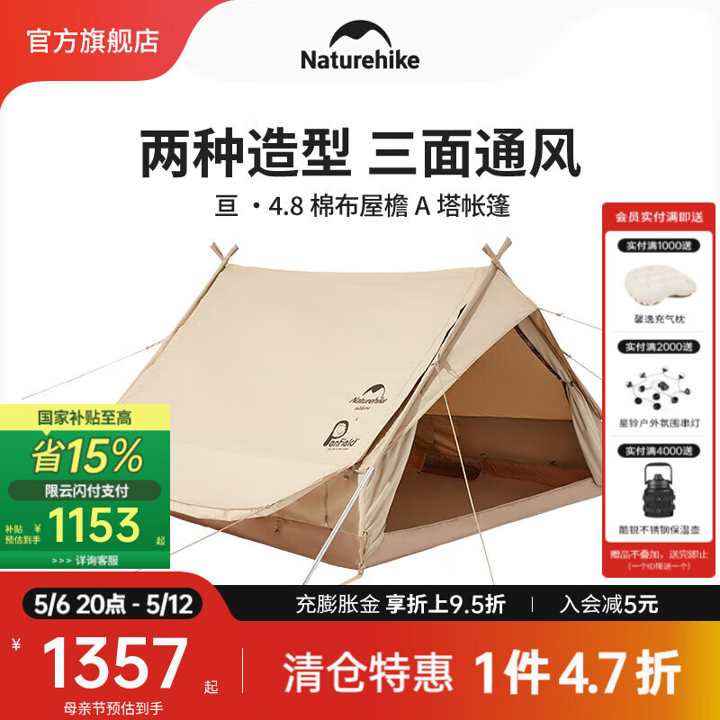 旗舰店NatureHike挪客棉布屋檐A塔帐篷亘 天幕二合一双人户外露营野炊野餐野营小屋 流沙金-Penfield联名款