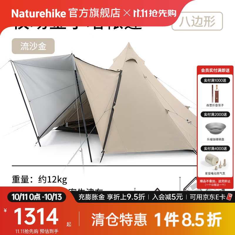 旗舰店Naturehike挪客牧场八边形金字塔帐篷 户外多人大空间 野营防雨防晒印第安帐 流沙金/5-8人
