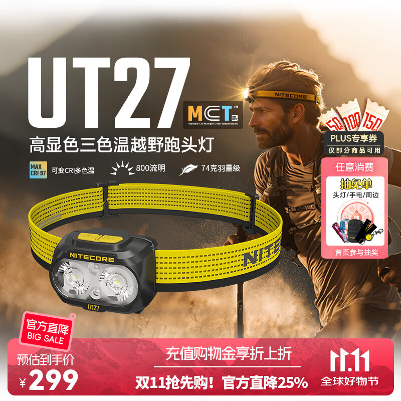 旗舰店奈特科尔【高显色3色温】ut27 mct轻量800流明高显色3色温越野超轻AAA头灯 UT27 MCT【黑色-专业版】