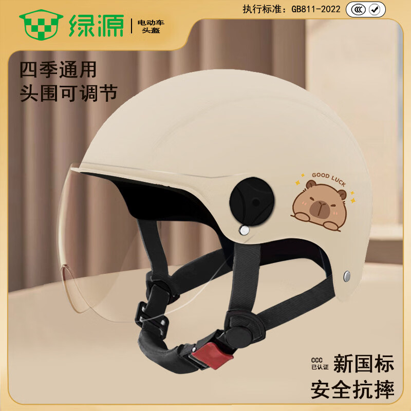 百亿补贴绿源(Luyuan)新国标儿童亲子可爱卡皮巴拉电瓶车头盔3C认证男女孩四季通用卡通动物头盔 米色【小童3-8岁】透明短镜