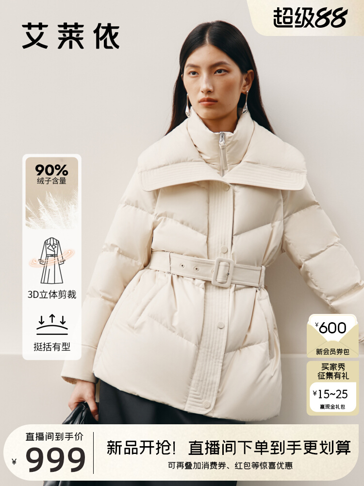 旗舰店【宋佳同款】艾莱依鹅绒羽绒服2025秋冬新款双层领收腰女短款外套