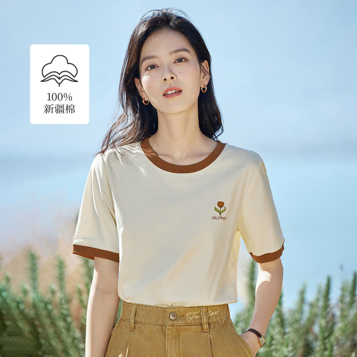 纯棉短袖正肩T恤夏季减龄宽松撞色圆领百搭刺绣上衣女