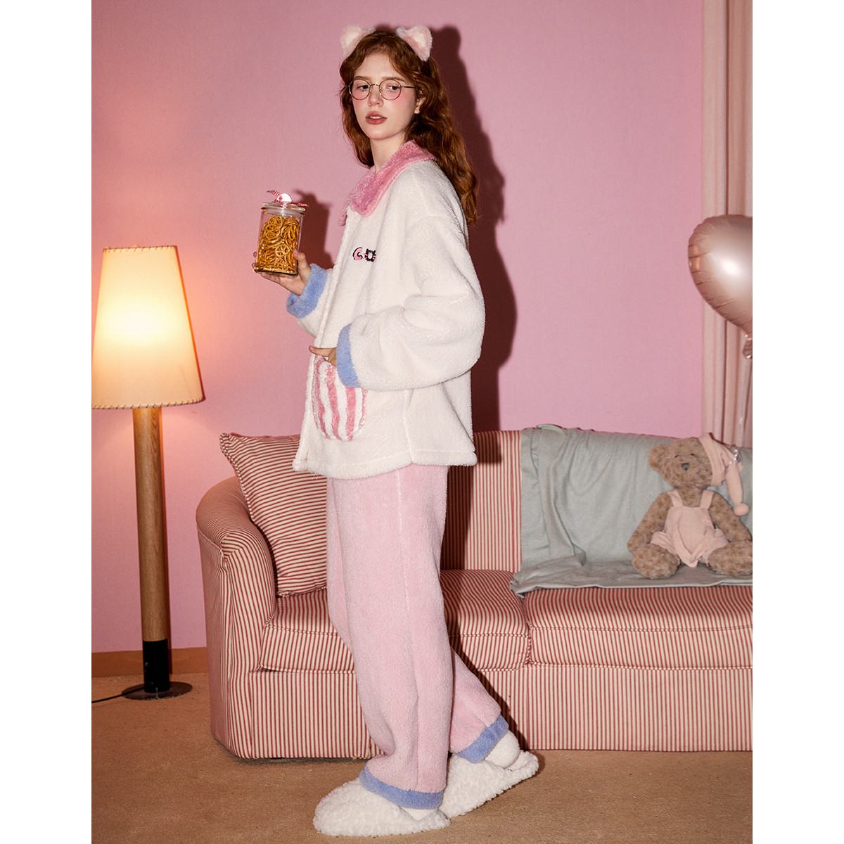 自营都市丽人内衣女睡衣套装秋冬法兰绒珊瑚绒保暖连帽卡通绒类家居服2H0109