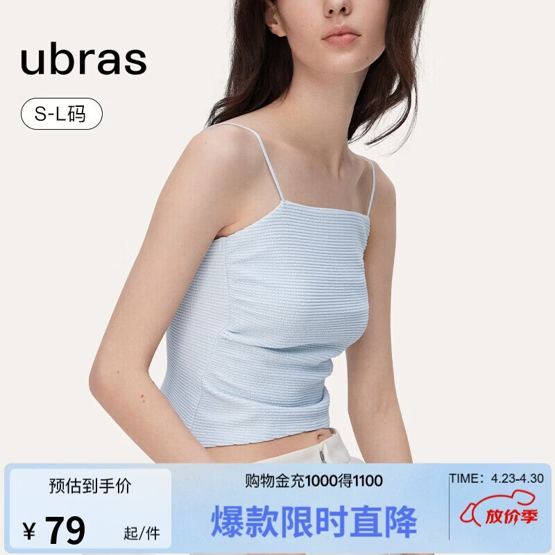 自营ubras刘雯同款甜妹风褶皱抹胸小吊带背心女士内搭美背上衣外穿涟漪蓝L