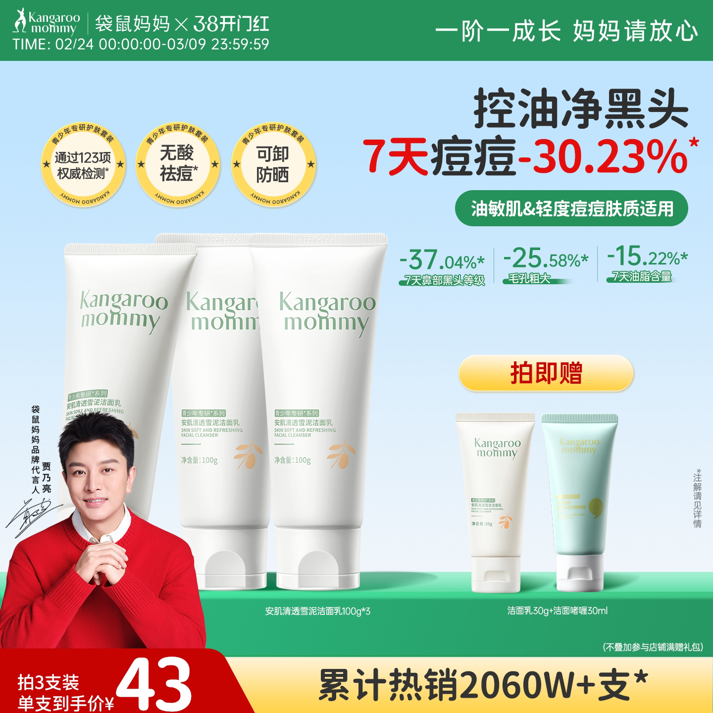 旗舰店袋鼠妈妈青少年洁面乳儿童专用控油祛痘男女孩青春期去黑头洗面奶