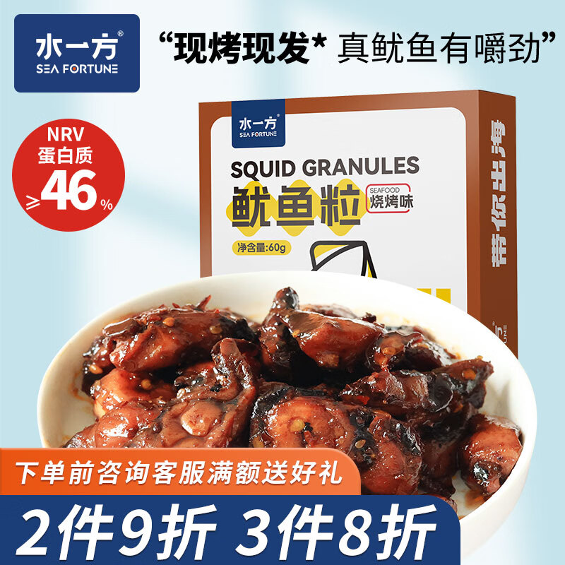 旗舰店水一方现烤耐嚼鱿鱼条即食高蛋白手撕鱿鱼条零食大连特产海味年货 烧烤味鱿鱼粒60g