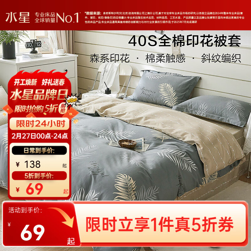 旗舰店水星家纺集团出品 百丽丝被套单件 100%全棉被套 学生纯棉被罩被套 (100%全棉&自然花卉系列) 慕叶 150cm*210cm