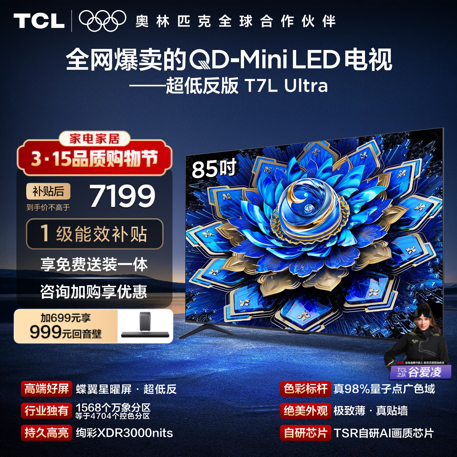 自营TCL电视 85T7L Ultra 85英寸 QD-Mini LED 蝶翼星曜屏 万象分区 绚彩XDR 超薄 国家补贴 T7L 护眼