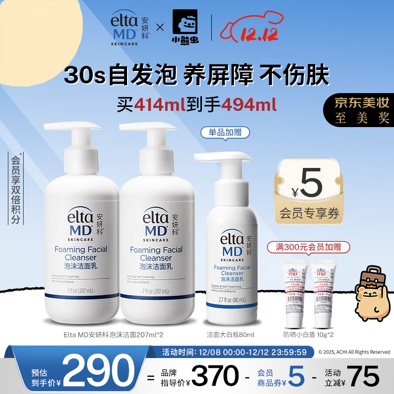 自营Elta MD安妍科洗面奶男女士氨基酸敏感肌泡沫洁面207ml*2温和清洁卸防晒