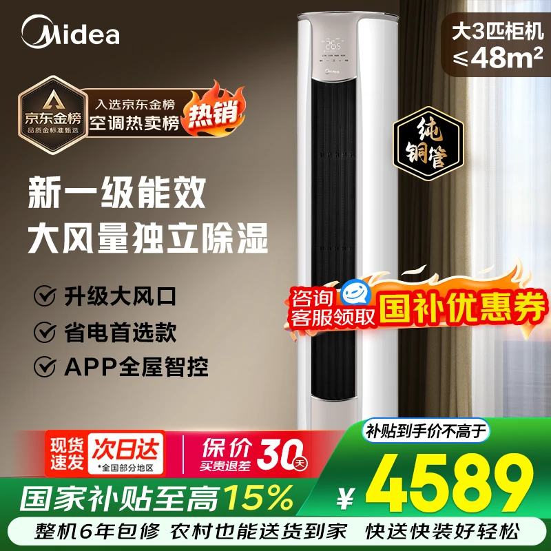 旗舰店美的(Midea)空调锐静二代新一级能效全直流智能变频四代自清洁冷暖两用节能省电低噪空调立式柜机 3匹 一级能效锐静二代