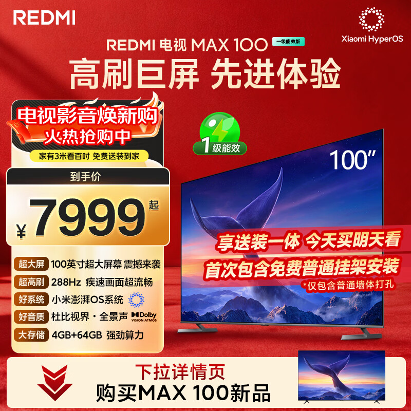 自营小米(MI)REDMI 电视 MAX100 一级能效版 100英寸 288Hz【送装一体服务】会议电视 L100RC-MAXE