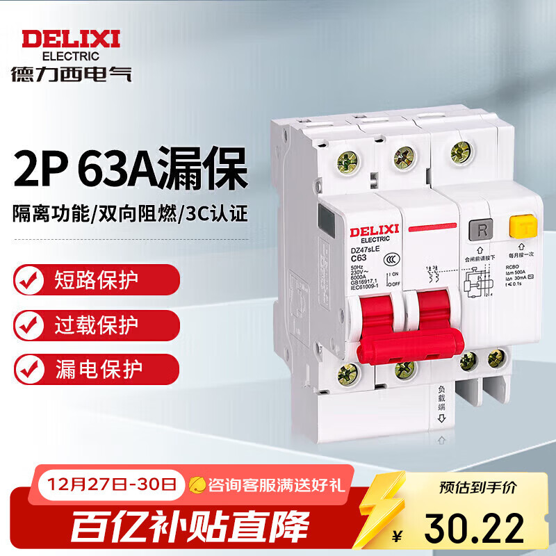 自营德力西电气空开断路器空气开关漏电保护开关DZ47sLE 2P 63A