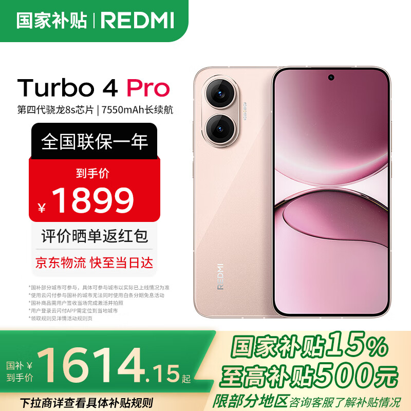 旗舰店小米(MI)REDMI 红米Turbo4 Pro 国家补贴 第四代骁龙8s 7550mAh长续航 IP68防水 小米红米新品5G手机 粉金色 12GB+256GB 【官方标配】
