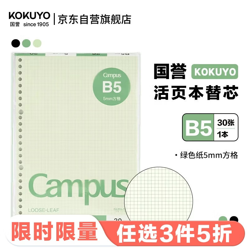 自营国誉(KOKUYO)B5彩色活页纸Campus活页本替芯笔记本子活页纸内页 5mm方格 30张绿色1本 WCN-CLL1314G