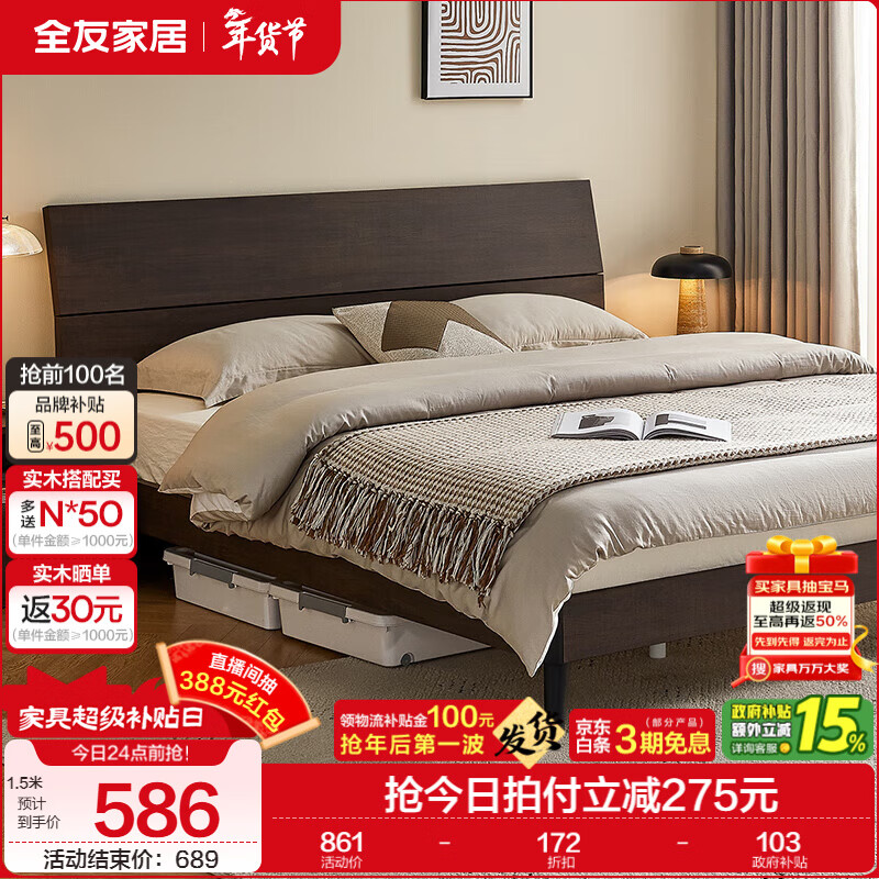 旗舰店全友家居现代简约高箱储物收纳床主卧1.8米x2米双人大床家具政府补贴 【炭黑色 | 高脚】单床 1.5x2米【爆款+性价比超高】
