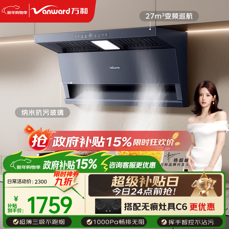 自营万和【蓝墨无痕DL01·纳米抗污玻璃】顶侧双吸抽排27风量变频大吸力不留纹变频三吸油烟机