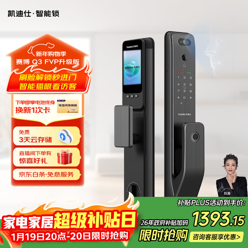 自营凯迪仕(KAADAS)智能锁 可视猫眼大屏人脸识别 智能门锁指纹锁 赛博Q3 FVP升级版