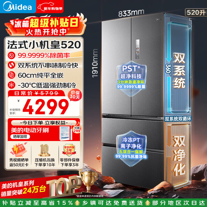 自营美的(Midea)M60小机皇520升法式多门冰箱零嵌双系统除菌大容量一级能效BCD-520WUFPZM(E)国家补贴