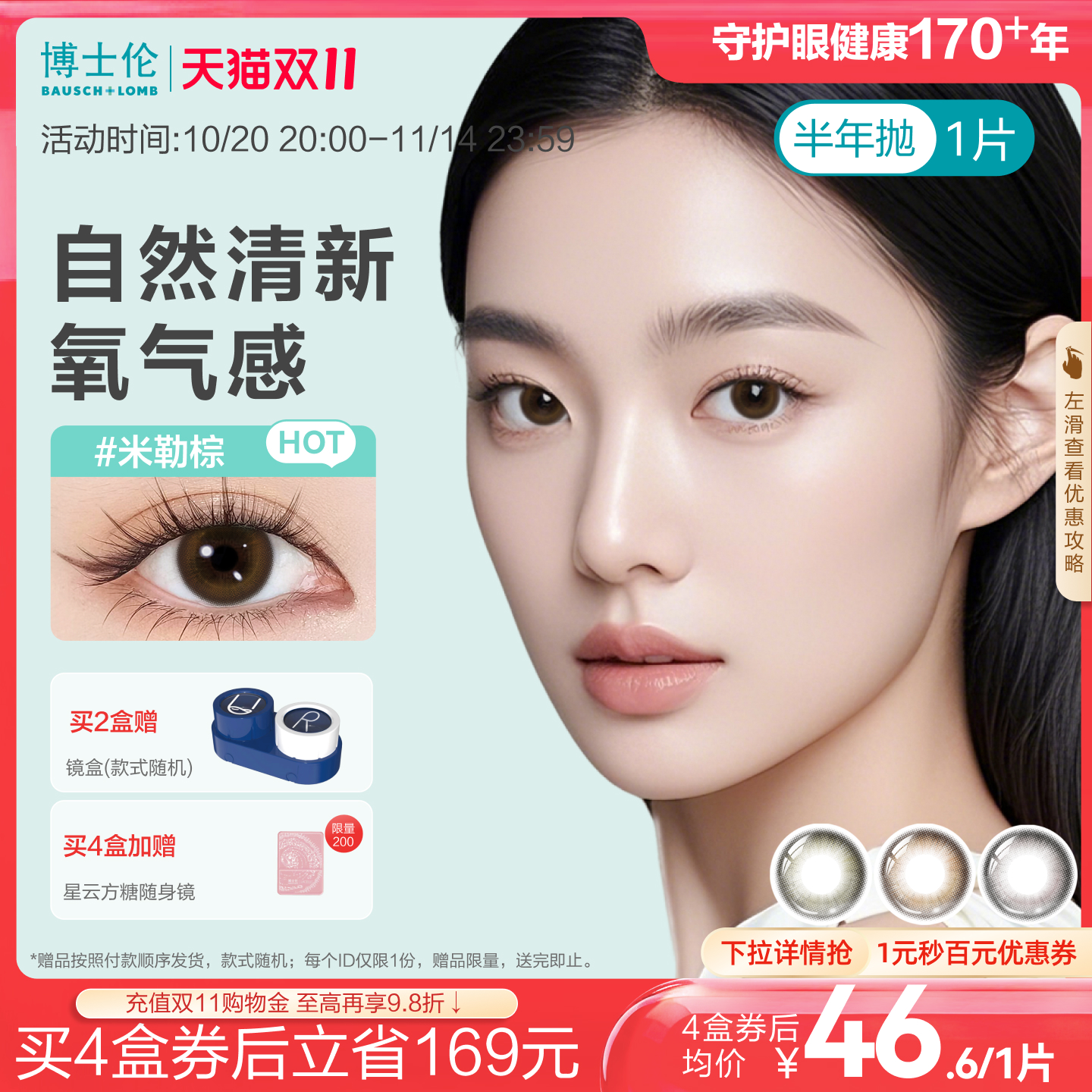 旗舰店博士伦美瞳半年抛彩色隐形眼镜近视蕾丝闪眸高定系列水凝胶1片