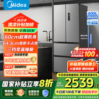 百亿补贴美的(Midea)417法式门多门四开门一级双变频风冷无霜大容量净味家用智能电冰箱国家补贴 MR-417WFPE