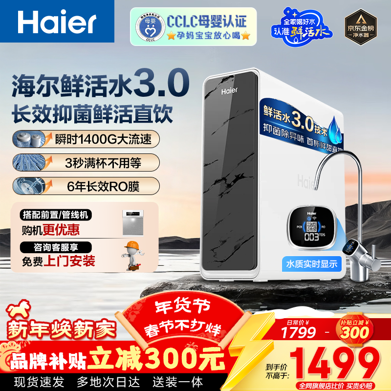旗舰店海尔(Haier)净水器家用鲜活水Pro瞬时1400G 6年长效RO膜反渗透厨房专用台下用冰饮净水机即加热直饮一体机R793 【净水年度金榜】瞬时1400G鲜活水Pro1200G 6年长效RO膜